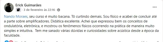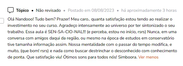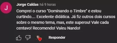 Não tem curso sobre timbragem com tamanha didática e aprofundamento adequado como esse. Para quem adquire é um grande investimento. Excelente o curso. Parabéns, Professor!!